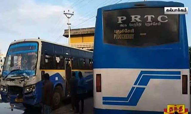 இருப்பினும் அந்த பேருந்து எதிர் திசையில் வந்த மற்றொரு அரசு பேருந்து மீது நேருக்கு நேராக மோதியது. இந்த விபத்தில் அதிர்ஷ்டவசமாக யாருக்கும் காயம் ஏற்படவில்லை. இது குறித்து தகவலறிந்து சம்பவ இடத்திற்கு வந்த கல்பாக்கம் போலீசார், ஓட்டுநர் ராதாகிருஷ்ணனை செங்கல்பட்டு அரசு மருத்துவமனைக்கு அனுப்பி வைத்தனர்.