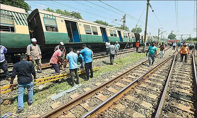 ஜாக்கி கருவி மூலம் ரெயில் சக்கரங்களை தண்டவாளத்தில் தூக்கி நிறுத்தும் பணியில் ஊழியர்கள் தீவிரமாக ஈடுபட்டனர்.