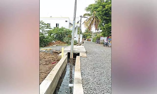 காஞ்சீபுரம் மாவட்டம் குன்றத்தூர் ஒன்றியத்திற்குட்பட்ட வரதராஜபுரம் ஊராட்சியில் உள்ள புவனேஸ்வரி நகர் சாலை பகுதியில் ஊரக வளர்ச்சி துறை சார்பில் மழை நீர் கால்வாய் அமைக்கப்பட்டுள்ளது. பொதுமக்களின் பயன்பாட்டுக்காக கட்டப்பட்டுள்ள கால்வாயின் நடுவே உள்ள மின்கம்பங்களை அகற்றாமல் அப்படியே சிமெண்டு கால்வாய்கள் கட்டப்பட்டுள்ளன.
