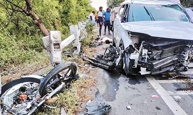 இதில் மோட்டார் சைக்கிளில் இருந்து தூக்கி வீசப்பட்ட இறைச்சி கடைக்காரர் ரமேஷ் சம்பவ இடத்திலேயே ரத்த வெள்ளத்தில் துடி துடித்து பரிதாபமாக உயிரிழந்தார். அவருடன் வந்த தம்பிரான் பலத்த காயம் அடைந்து உயிருக்கு போராடி கொண்டிருந்தார். காரில் வந்த டிரைவர் உட்பட 5 பேர் லேசான காயங்களுடன் உயிர் தப்பினர். இந்த சம்பவத்தை பார்த்த அக்கம் பக்கத்தினர் உடனடியாக உயிருக்கு போராடிக் கொண்டிருந்த தம்பிரானை மீட்டு செங்கல்பட்டு அரசு ஆஸ்பத்திரியில் சிகிச்சைக்காக சேர்த்தனர். ஆனால் அங்கு சிகிச்சை பலனின்றி தம்பிரானும் பரிதாபமாக உயிரிழந்தார்.
