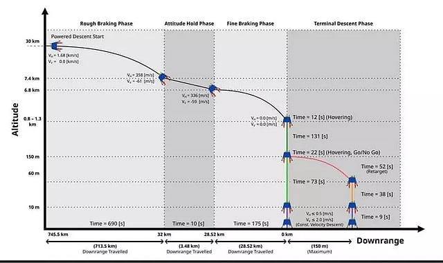 கிடைமட்ட வேகம் குறையும் போது, லேண்டர் இறங்குகிறது. 690-வினாடி கடினமான கட்டத்திற்குப் பிறகு, லேண்டர் நிலவின் மேற்பரப்பில் இருந்து ஏழரை கிலோமீட்டர் உயரத்தை எட்டும்.