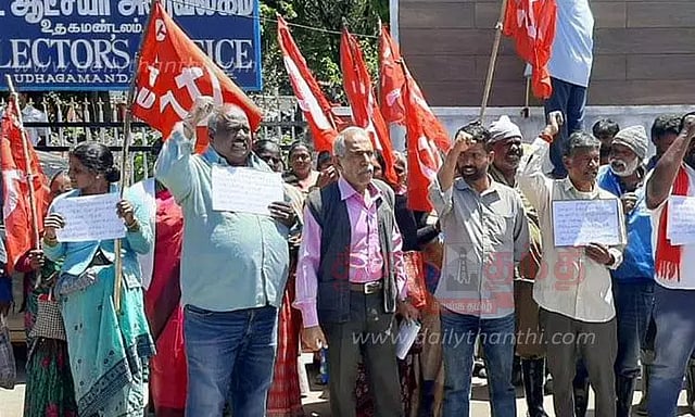 தொழிலாளர் விரோத போக்கை கடைபிடிக்கும் காஞ்சீபுரம் மாவட்ட கலெக்டரை உடனடியாக மாற்றக்கேரி சி.ஐ.டி.யு. தொழிற்சங்கம் சார்பில் நேற்று நீலகிரி மாவட்டம் ஊட்டியில் கலெக்டர் அலுவலகம் முன்பு ஆர்பாட்டம் நடந்தது. இதற்கு மாவட்ட தலைவர் சங்கரலிங்கம் தலைமை தாங்கினார். மாவட்ட பொருளாளர் நவீன் சந்திரன் தொடங்கி வைத்தார். மாவட்ட செயலாளர் வினேத் கலந்து கொண்டு பேசினார்.