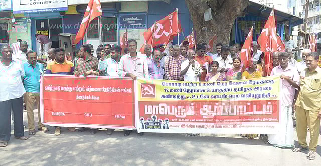 இதற்கு மாவட்ட செயலாளர் பிரபாகரன் தலைமை தாங்கினார். மாவட்ட தலைவர் கே.ஆர்.கணேசன் முன்னிலை வகித்தார். இதில் சங்க நிர்வாகிகள், தொழிலாளர்கள் கலந்து கொண்டனர். அப்போது 12 மணி நேர வேலை முறை மசோதாவுக்கு எதிர்ப்பு தெரிவித்தும், மசோதாவை திரும்ப பெற வலியுறுத்தியும் கோஷமிட்டனர்.