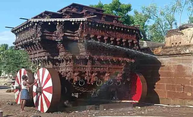 இதனால் 2 தேர்களிலும் தூசி அதிக அளவு படிந்து இருந்தது. இதனையொட்டி தண்ணீரை பீய்ச்சி அடித்து 2 தேர்களையும் சுத்தம் செய்யும் பணி நடைபெற்றது.