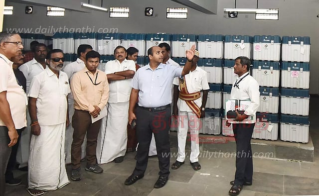 தஞ்சை கலெக்டர் அலுவலகத்தில் வைக்கப்பட்டுள்ள மின்னணு வாக்குப்பதிவு எந்திரங்கள் சரிபார்ப்பு பணி நடந்தது. அப்போது கலெக்டர் தீபக்ஜேக்கப் அனைத்து கட்சி பிரதிநிதிகளுடன் வாக்குப்பதிவு எந்திரங்களை பார்வையிட்டு ஆலோசனை நடத்திய போது எடுத்த படம்.