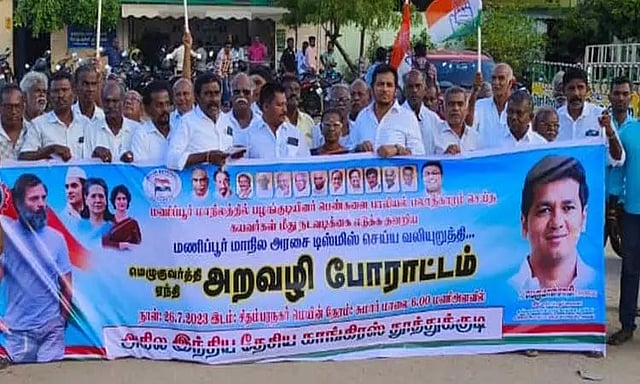 மணிப்பூர் மாநிலத்தில் பழங்குடியினர் பெண்களை பாலியல் வன்முறை செய்த மணிப்பூர் மாநில அரசை டிஸ்மிஸ் செய்யக் கோரி காங்கிரஸ் கட்சி சார்பில் ஆர்ப்பாட்டம் நடந்தது. ஆர்ப்பாட்டத்துக்கு முன்னாள் இளைஞர் காங்கிரஸ் தலைவர் மற்றும் ஐ.என்.டி.யு.சி மாநில பொது செயலாளர், மாநில பொதுக்குழு உறுப்பினர் கே.பெருமாள்சாமி தலைமை தாங்கினார். முன்னாள் மாவட்ட தலைவர் முத்துக்குட்டி முன்னிலை வகித்தார்.