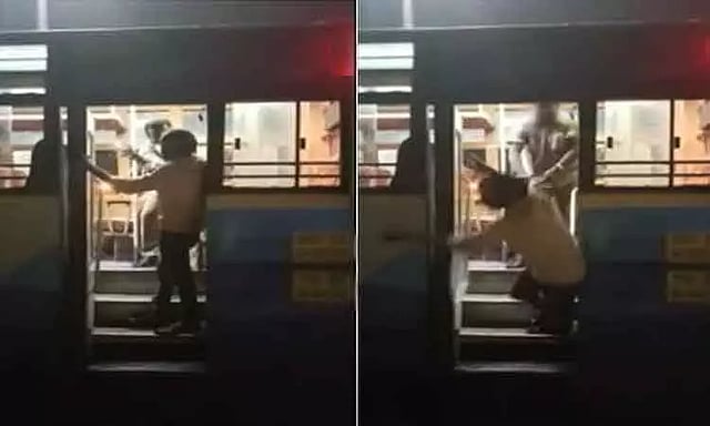 ஆனால் போதையில் இருந்த அந்த நபரால் கீழே இறங்க முடியவில்லை. இதையடுத்து படிக்கட்டிலேயே தள்ளாடியவாறு நின்று கொண்டிருந்த அந்த போதை ஆசாமியை, பிரகாஷ் கீழே தள்ளினார். இந்த சம்பவம் தொடர்பான வீடியோ சமூக வலைதளங்களில் வைரலாக பரவியது.
