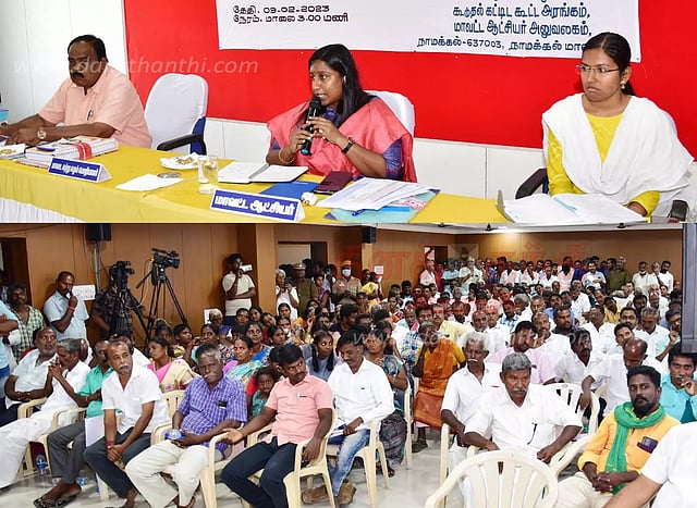 நாமக்கல் மாவட்ட கலெக்டர் அலுவலகத்தில் நேற்று காலை அக்கலாம்பட்டி கிராமத்தில் கல்குவாரி அமைப்பது தொடர்பான கருத்து கேட்பு கூட்டம் நடந்தது. இதேபோல் நேற்று மாலையில் கோக்கலை கிராமத்தில் 4 இடங்களில் கல்குவாரி அமைப்பது தொடர்பான கருத்துகேட்பு கூட்டம் நடந்தது. இந்த கூட்டத்துக்கு மாவட்ட கலெக்டர் ஸ்ரேயாசிங் தலைமை தாங்கினார்.
