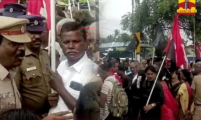இதில் போலீசாருக்கும், கம்யூனிஸ்டு கட்சியினருக்கும் இடையே மோதல் மற்றும் தள்ளுமுள்ளு உருவானது. இந்த போராட்டத்தில் ஈடுபட்ட பெண்கள் உள்பட 130 பேரை கைது செய்த போலீசார் அவர்களை 3 பேருந்துகளில் ஏற்றி அழைத்து சென்று அதே பகுதியில் உள்ள தனியார் மண்டபத்தில் அடைத்தனர். அதன்பின்னர் கவர்னர் அந்த பகுதியை கடந்து பல்கலைக்கழகத்திற்கு சென்று பட்டமளிப்பு விழாவில் கலந்துகொண்டார்.