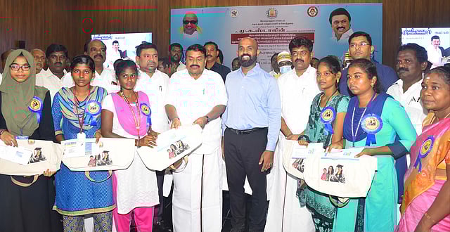 ராமநாதபுரத்தில் புதுமைப்பெண் திட்டத்தின் கீழ் கல்லூரியில் படிக்கும் 375 மாணவிகளுக்கு மாதம் ரூ.1000 பெறுவதற்கான டெபிட் கார்டு மற்றும் புதுமைப்பெண் பெட்டகத்தினை அமைச்சர் ராஜகண்ணப்பன் வழங்கினார்.