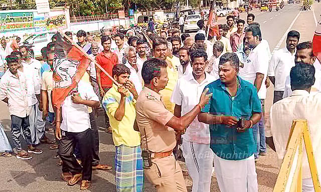 அதன்படி, திருச்சி மாநகர் விமானநிலைய பகுதி செயலாளர் ஏர்போர்ட் விஜி தலைமையில் திருச்சி விமான நிலையத்தின் எதிரில் உள்ள அரசு சுகாதாரத்துறை பணிமனை வளாக சுவரில் வாழ்த்து தெரிவித்து, அ.தி.மு.க.வினரால் விளம்பரம் செய்யப்பட்டிருந்தது. நேற்று காலை அந்த விளம்பரத்தில் பகுதி செயலாளர் பெயர் மட்டும் தார் பூசி அழிக்கப்பட்டு இருந்தது. இதைப்பார்த்த 65-வது வட்ட அ.தி.மு.க. செயலாளர் விநாயகமூர்த்தி தலைமையில் சுமார் 50-க்கும் மேற்பட்டோர் விமான நிலைய போலீஸ் நிலையத்தை முற்றுகையிட்டனர். அப்போது, போலீசாருக்கும், அ.தி.மு.க.வினருக்கும் இடையே தள்ளுமுள்ளு ஏற்பட்டது. இதனால் போலீஸ் நிலையம் முன் புதுக்கோட்டை சாலையில் மறியலில் ஈடுபட்டனர். அ.தி.மு.க.வின் இந்த திடீர் போராட்டம் காரணமாக அங்கு பரபரப்பு ஏற்பட்டதுடன், போக்குவரத்தும் சிறிது நேரம் பாதிக்கப்பட்டது. பின்னர் பேச்சுவார்த்தையை தொடர்ந்து, சுவா விளம்பரத்தில் பெயரை அளித்த மர்மநபர்களை கைது செய்யக்கோரி அவர்கள் போலீஸ் நிலையத்தில் புகார் அளித்து சென்றனர்.