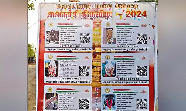 இதுமட்டுமின்றி வட்டம், மாவட்டம், ஆதார் எண், இணையதள முகவரி, பார்கோடு மற்றும் ஆதாரம் எங்க ஊரு, எங்க ராஜ்ஜியம் என்று அச்சிடப்பட்டிருந்தது. 6 தெய்வங்களின் ஆதார் அட்டைகளை ஒருங்கிணைத்து பேனர் வைக்கப்பட்டிருந்தது. விழாவுக்கு வந்த அனைத்து பக்தர்களின் கவனத்தையும், ஆதார் போல் இடம் பெற்றிருந்த வினோத பேனர் ஈர்த்தது.