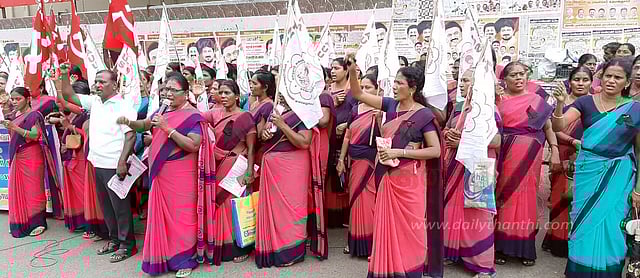 நாமக்கல் பூங்கா சாலையில் நடந்த ஆர்ப்பாட்டத்துக்கு சங்கத்தின் மாநில துணை தலைவர் ஜெயக்கொடி தலைமை தாங்கினார். ஒன்றிய தலைவர் மலர்க்கொடி, செயலாளர் பிரேமா, பொருளாளர் பரமேஸ்வரி ஆகியோர் முன்னிலை வகித்தனர். இதில் சி.ஐ.டி.யு. மாவட்ட செயலாளர் வேலுச்சாமி, இந்திய மாணவர் சங்கத்தின் மாவட்ட செயலாளர் சரவணன் ஆகியோர் கலந்து கொண்டு கோரிக்கைகளை விளக்கி பேசினர்.