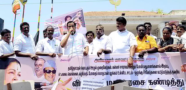 அரியலூர் எம்.ஜி.ஆர். சிலை அருகில் மாவட்ட அ.தி.மு.க. சார்பில் தமிழக அரசை கண்டித்தும், மதுக்கடைகளை மூடக்கோரியும் கண்டன ஆர்ப்பாட்டம் நடந்தது. மாவட்ட செயலாளர் தாமரை ராஜேந்திரன் தலைமையில் நடந்த இந்த ஆர்ப்பாட்டத்தில் அவர் தெரிவிக்கையில், விஷ சாராயம் குடித்து தமிழகத்தில் 24 பேர் இறந்துள்ளனர். மாநிலம் முழுவதும் கள்ள சாராயம் விற்கப்படுகிறது. தி.மு.க. அரசு நாங்கள் ஆட்சிக்கு வந்தால் மதுக்கடைகளை உடனே மூடுவோம் என்று கூறியது. ஆனால் மதுபான கூடத்தில் 24 மணி நேரமும் மது விற்கப்படுகிறது. தஞ்சாவூரில் மதுபாரில் மது குடித்த 2 பேர் இறந்து போனார்கள். பல இடங்களில் பாலியல் வன்முறைகளும் நடைபெறுகிறது. இதனை உடனே தடுத்து நிறுத்த வேண்டும் என்றார். தொடர்ந்து ஆர்ப்பாட்டத்தில் கலந்து கொண்டவர்கள் கோரிக்கைகளை வலியுறுத்தி பல்வேறு கோஷங்களை எழுப்பினர். இந்த ஆர்ப்பாட்டத்தில் மாவட்ட துணை செயலாளர் ராமஜெயலிங்கம் உள்பட அனைத்து அணி பொறுப்பாளர்களும் கலந்து கொண்டனர்.