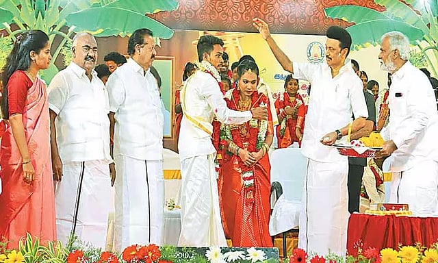 திருமண விழாவில் தாலி கயிற்றில் 4 கிராம் தங்கம், மணமகனுக்கு பட்டு வேட்டி-சட்டை, மணப்பெண்ணுக்கு பட்டுப்புடவை வழங்கப்பட்டது. இத்துடன் கட்டில், மெத்தை, பீரோ, கியாஸ் அடுப்பு, கிரைண்டர், மிக்சி, குக்கர், அயன் பாக்ஸ், எவர் சில்வர் குடம், தவலை, தட்டு, டம்ளர், கரண்டி உள்பட சமையல் பாத்திரங்கள், காமாட்சி அம்மன் விளக்கு, பித்தளையிலான பூஜை பொருட்கள் என ரூ.50 ஆயிரம் மதிப்பீல் சீர் வரிசை பொருட்கள் மணமக்களுக்கு வழங்கப்பட்டன. இந்த சீர்வரிசை பொருட்களை வழங்கும் அடையாளமாக ஒரு ஜோடிக்கு இப்பொருட்களை முதல்-அமைச்சர் மு.க.ஸ்டாலின் வழங்கினார். அப்போது அந்த ஜோடி சீர்வரிசை பொருட்களுடன் முதல்-அமைச்சர் மு.க.ஸ்டாலினுடன் புகைப்படம் எடுத்துக்கொண்டனர்.