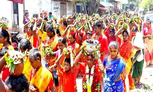 முன்னதாக திருப்புவனம் புதூர் மாரியம்மன், ரேணுகாதேவி அம்மன் கோவிலில் இருந்து தொடங்கிய ஊர்வலம் போலீஸ் லைன் தெரு, தேரடி வீதி, கீழரத வீதி, மதுரை-மண்டபம் நெடுஞ்சாலை, நரிக்குடி ரோடு, உச்சிமாகாளி அம்மன் கோவில் வீதி, சந்தை திடல், ஆற்றுப் பாலம் வழியாக வைகை வடகரையில் உள்ள கோவிலுக்கு வந்தடைந்தது.