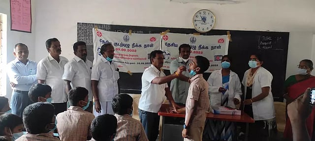 பரமத்திவேலூர் தாலுகா, பரமத்தி பேரூராட்சியில் தேசிய குடற்புழு நீக்க நாள் மாத்திரைகள் வழங்கும் விழா பரமத்தி அரசு ஆண்கள் மேல்நிலைப்பள்ளி வளாகத்தில் நடைபெற்றது. நிகழ்ச்சிக்கு பரமத்தி பேரூராட்சி தலைவர் மணி தலைமை தாங்கினார். பரமத்தி பேரூராட்சி துணைத் தலைவர் ரமேஷ் பாபு, கவுன்சிலர் நாச்சிமுத்து, பள்ளி தலைமை ஆசிரியர் சண்முகம் ஆகியோர் முன்னிலை வகித்தனர். நாமக்கல் மாவட்ட சுகாதாரப் பணிகள் பூச்சியியல் வல்லுனர் சேகர் மாணவர்களுக்கு மாத்திரைகள் வழங்கும் நிகழ்ச்சியை தொடங்கி வைத்தார். வட்டார மருத்துவ அலுவலர் மேகலா மாணவர்களுக்கு தன் சுத்தம் குறித்து பேசினார். மேலும் பரமத்தி வட்டாரத்திற்கு உட்பட்ட அரசு மற்றும் தனியார் பள்ளியில் பயிலும் 14 ஆயிரத்து 112 மாணவ, மாணவிகளுக்கும், அங்கன்வாடியில் 3 ஆயிரத்து 561 குழந்தைகளுக்கும், மொத்தம் 17 ஆயிரத்து 673 மாத்திரைகள் வழங்கப்பட உள்ளதாக கூறினார். பரமத்தி அரசு ஆரம்ப சுகாதார நிலைய மருத்துவ அலுவலர் சுதமதி கைகளை கழுவும் முறைகளை பற்றி கூறி விழிப்புணர்வு ஏற்படுத்தினார். இந்த நிகழ்ச்சியில் வட்டார சுகாதார மேற்பார்வையாளர் மணிவண்ணன், சுகாதார ஆய்வாளர்கள் குமார், ராஜ்குமார், பெரியசாமி, அருண், தனபால் மற்றும் பள்ளி ஆசிரியர்கள் கலந்து கொண்டனர்.