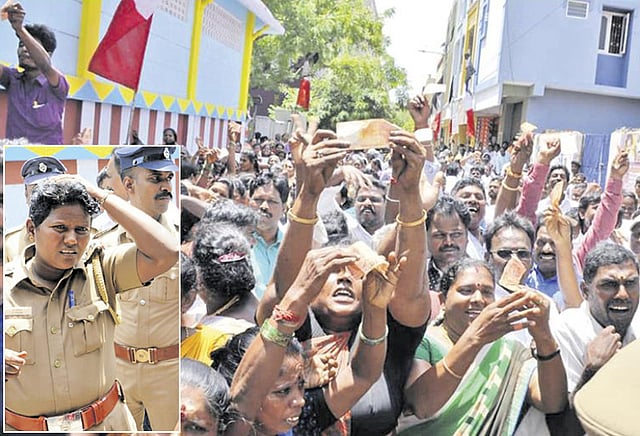 தினகரன் வந்த கார் மீதும் கல் வீசப்பட்டது. இதனால் அந்த பகுதியே போர்க்களமாக மாறியது. இருபுறமும் கயிறுகளை கட்டி தடுப்பு வேலிகள் அமைத்து இருதரப்பினரையும் போலீசார் கட்டுப்படுத்த முயன்றனர். ஆனால் அவர்கள், தடுப்பு வேலியை தாண்டி வந்து தாக்குதலில் ஈடுபட முயன்றனர்.