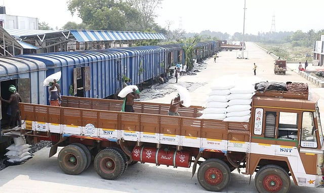 நூற்றுக்கணக்கான தொழிலாளர்கள் அரிசி மூட்டைகளை ரெயில் பெட்டிகளில் இருந்து லாரிகளில் ஏற்றும் பணியில் ஈடுபட்டனர். பின்னர் அவை கிடங்குகளுக்கு கொண்டு சென்று பாதுகாப்பாக வைக்கப்பட்டது. முன்னதாக, முதல் சரக்கு ரெயிலில் வாழை மரங்கள் தோரணம் கட்டுப்பட்டு வரவேற்பு கொடுக்கப்பட்டது.