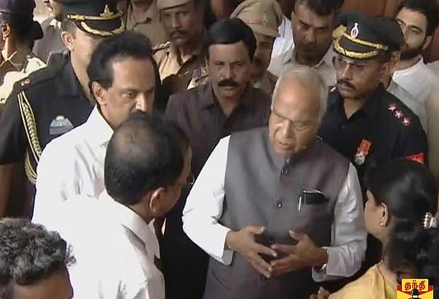 தி.மு.க. தலைவர் கருணாநிதி மறைவுக்கு தமிழக ஆளுநர் பன்வாரிலால் புரோஹித் நேரில் அஞ்சலி செலுத்தினார். அதன்பின்னர் அவர் மு.க. ஸ்டாலின் மற்றும் கனிமொழி ஆகியோருக்கு ஆறுதல் தெரிவித்து பேசினார்.