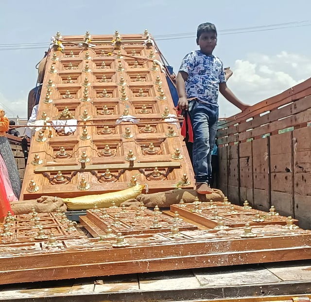 மேலும் கொண்டுவரப்பட்ட கதவிற்கு பெண்கள் ஆரத்தி எடுத்து மஞ்சள் நீரை தெளித்து வரவேற்றனர். அதன் பின்னர் ராஜகோபுரத்தில் அந்த கதவை பொருத்தி ஏராளமான பக்தர்கள் வணங்கி வழிபட்டனர். இதற்கான ஏற்பாடுகளை விழா கமிட்டியினர் செய்து வருகின்றனர்.