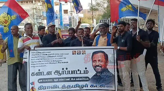 திராவிட தமிழர் கட்சியினர் நெல்லை வண்ணார்பேட்டையில் நேற்று ஆர்ப்பாட்டம் நடத்தினார்கள். மாவட்ட கொள்கை பரப்பு செயலாளர் சுந்தரபாண்டியன் தலைமை தாங்கி ஆர்ப்பாட்டத்தை தொடங்கி வைத்து பேசினார். அருந்ததியர் உள் இட ஒதுக்கீட்டுக்கு எதிராக பேசி வருகிற சீமானை கைது செய்ய வேண்டும் என்று கூறி இந்த ஆர்ப்பாட்டம் நடந்தது. ஆர்ப்பாட்டத்தில் மாநில நிதி செயலாளர் சங்கர், மாவட்ட செயலாளர் திருக்குமரன், தமிழ் புலிகள் கட்சி மாவட்ட செயலாளர் தமிழரசு உள்பட பலர் கலந்து கொண்டனர்.