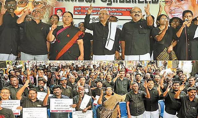 ஆர்ப்பாட்டத்திற்கு திராவிடர் கழக தலைவர் கி.வீரமணி தலைமை தாங்கினார். தென்சென்னை மாவட்ட தலைவர் வில்வநாதன் வரவேற்று பேசினார். பிரசார செயலாளர் அருள்மொழி கண்டன உரையாற்றினார்.