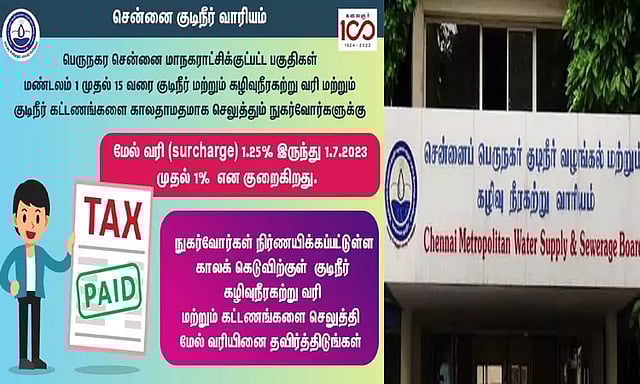 பெருநகர சென்னை மாநகராட்சிக்கு உட்பட்ட பகுதிகளில் குடிநீர், கழிவு நீரகற்று வரியை காலதாமதமாக செலுத்தும் நுகர்வோருக்கு மாதத்துக்கு 1.25 என்ற சதவீதத்தில் மேல் வரி வசூலிக்கப்பட்டு வருகிறது. நுகர்வோரின் நலனை கருத்தில் கொண்டு இந்த மேல்வரி வரும் ஜூலை 1-ந்தேதியில் இருந்து 1 சதவீதமாக குறைக்க சென்னை குடிநீர் வாரியம் தீர்மானித்துள்ளது.எனவே, நுகர்வோர்கள் சென்னை குடிநீர் வாரியத்துக்கு செலுத்த வேண்டிய கட்டணங்களை உரிய காலத்துக்குள் செலுத்தி வாரியத்தின் வளர்ச்சிப்பணிக்கு ஒத்துழைக்க வேண்டும்.