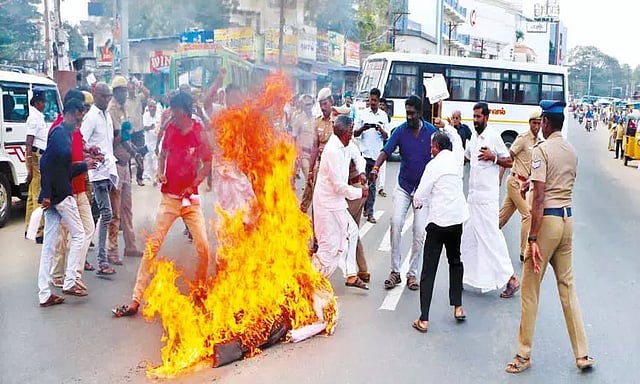 இதை பார்த்த போலீசார் வேகமாக ஓடி வந்தனர். ஆர்ப்பாட்டத்தில் ஈடுபட்டவர்களும் ஓடி வந்து உருவபொம்மையை அணைக்க விடாமல் அங்கும், இங்குமாக உருவபொம்மையை இழுத்து சென்றனர். மேலும் தங்கள் கைகளில் வைத்து இருந்த ஹல்தரின் உருவப்படங்களையும் தீ வைத்து கொளுத்தினர்.