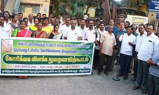 1.12.2019 முதல் மின்வாரிய பணியாளர்களுக்கு வழங்க வேண்டிய ஊதிய உயர்வு உள்ளிட்ட பணப்பயன்களை உடனடியாக வழங்க வேண்டும், பணியாளர்கள் ஏற்றுக்கொள்கின்ற வகையில் அரசு உத்தரவாதத்துடன் கூடிய முத்தரப்பு ஒப்பந்தத்தை ஏற்படுத்த வேண்டும், 58 ஆயிரம் காலிப்பணியிடங்களை நிரப்ப வேண்டும், தேர்தல் வாக்குறுதியின்படி பணியாளர்களுக்கு பழைய ஓய்வூதிய திட்டத்தை அமல்படுத்த வேண்டும் என்பன போன்ற பல்வேறு கோரிக்கைகளை வலியுறுத்தி நேற்று தமிழகம் முழுவதும் தமிழ்நாடு மின்வாரிய தொழிற்சங்கங்களின் கூட்டு நடவடிக்கைக்குழுவின் சார்பில் அந்தந்த மின்வாரிய மேற்பார்வை பொறியாளர் அலுவலகங்கள் முன்பு ஆர்ப்பாட்டம் நடைபெற்றது.