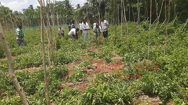 தேன்கனிக்கோட்டை அருகே விவசாய நிலங்களில் புகுந்த யானைகள் தக்காளி செடிகளை சேதப்படுத்தின.