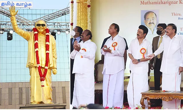 சென்னை - ஓமந்தூரார் அரசினர் தோட்ட வளாகத்தில், பல்நோக்கு உயர் சிறப்பு மருத்துவமனையின் முன்புறம் அண்ணா சாலை ஓரத்தில் 12 அடி உயர பீடத்தில், 16 அடி உயரத்தில் ரூ.1.7 கோடி மதிப்பில் நிறுவப்பட்டுள்ள மறைந்த முன்னாள் முதல்வர் கருணாநிதியின் முழு உருவ வெண்கலச் சிலையை துணை ஜனாதிபதி வெங்கய்யா நாயுடு இன்று திறந்து வைத்தார்.