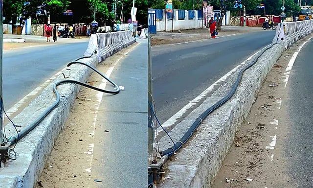 இந்நிலையில், இந்த சாலையின் நடுவே சிமெண்டால் ஆன தடுப்புக்கட்டைகள் அமைக்கப்பட்டுள்ளன. சாலைகளின் நடுவே செல்லும் மின் ஒயர்கள் இந்த தடுப்புக்கட்டையின் வழியே செல்லும் வகையில் அமைக்கப்பட்டுள்ளது.