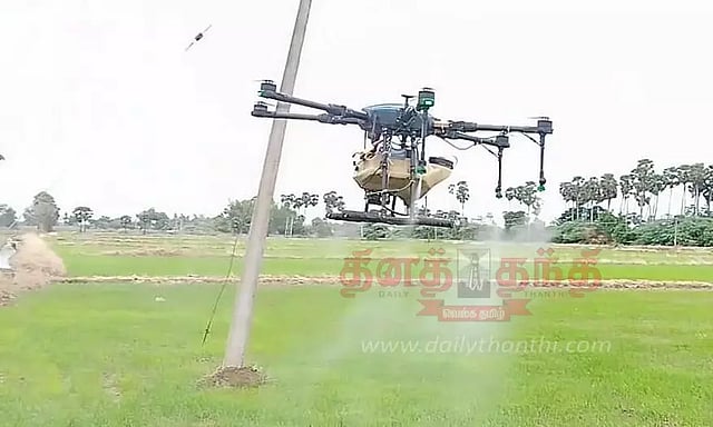 திருவாரூர் மாவட்டத்தில் பரவலாக பல்வேறு இடங்களில் டிரோன்கள் மூலம் வயலுக்கு பூச்சி மருந்து தெளிக்கப்பட்டு வருகிறது. டிரோன்கள் மூலம் பூச்சி மருந்து தெளிக்கும் போது குறைந்த நேரத்தில் அதிக பரப்பில் மருந்து தெளிக்க முடிகிறது.