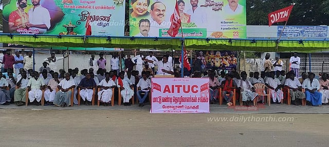 இதற்கு ஏ.ஐ.டி.யூ.சி. தொகுதி பொறுப்பாளர் முருகேசன் தலைமை தாங்கினார். விவசாய சங்க மாவட்ட தலைவர் பாலசுந்தரம் உண்ணாவிரத போராட்டத்தை தொடங்கி வைத்தார். இதில் ஏ.ஐ.டி.யூ.சி. மாவட்ட துணைத் தலைவர் காளிதாஸ், இந்திய கம்யூனிஸ்டு ஒன்றிய செயலாளர் கருப்பையா, விவசாய தொழிலாளர் சங்க மாவட்ட துணைத் தலைவர் ராஜமாணிக்கம், இந்திய கம்யூனிஸ்டு நகர செயலாளர் மூர்த்தி, விவசாய தொழிலாளர் சங்க நகர பொறுப்பாளர் சித்திரவேலு மற்றும் மாட்டுவண்டி தொழிலாளர்கள் 250 பேர் கலந்து கொண்டு கோரிக்கைகளை வலியுறுத்தி கோஷம் எழுப்பினர்.