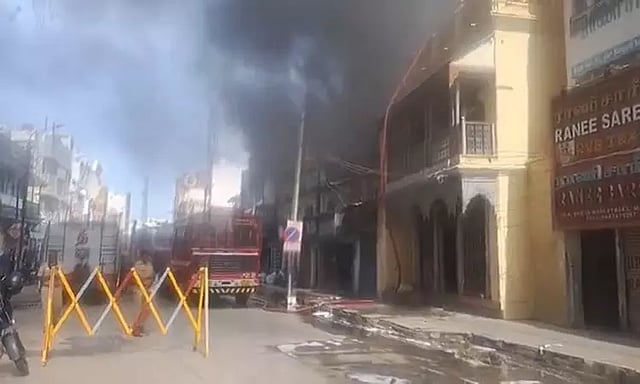 மதுரை மீனாட்சி அம்மன் கோவில் அருகே தெற்கு மாசி வீதியில் உள்ள பிளாஸ்டிக் கடையின் முதல் தளத்தில் பயங்கர தீ விபத்து ஏற்பட்டுள்ளது. தீ அடுத்தடுத்து மற்ற கடைகள் மற்றும் வீடுகளுக்கும் பரவியுள்ளது. தீ விபத்து குறித்து தகவலறிந்து சம்பவ இடத்திற்கு வந்த தீயணைப்புத்துறையினர் 5 தீயணைப்பு வாகனங்கள் உதவியுடன் தீயை அணைக்கும் பணியில் தீவிரமாக ஈடுபட்டு வருகின்றனர்.