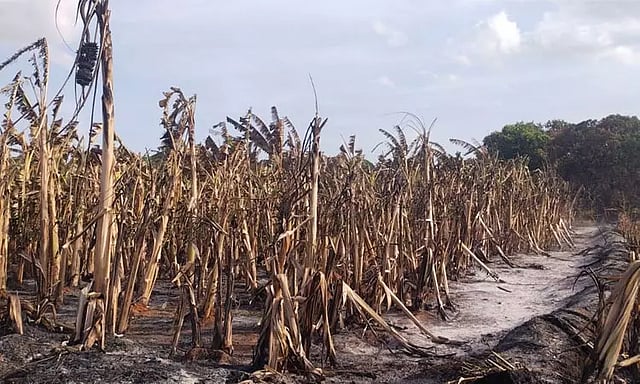நேற்று மாலை அந்த வாழை தோட்டத்தின் வேலியில் திடீரென தீ பிடித்துள்ளது. பின்னர் காற்றில் வேகமாக பரவிய தீயினால் சுமார் 6 ஏக்கரில் பயிரிடப்பட்டிருந்த சுமார் 7 ஆயிரம் வாழைகள் முற்றிலுமாக தீயில் எரிந்து நாசமாயின.