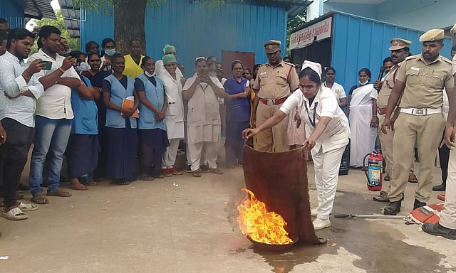 பழனி தீயணைப்பு நிலையம் சார்பில் பழனி அரசு மருத்துவமனையில் பணியாளர்களுக்கு தீத்தடுப்பு பயிற்சி மற்றும் ஒத்திகை நேற்று நடைபெற்றது. இதில் தீயணைப்பு நிலைய அலுவலர் பாஸ்கரன் தலைமையிலான தீயணைப்பு படைவீரர்கள் கலந்துகொண்டு, தீ விபத்து ஏற்பட்டால் எவ்வாறு தடுப்பது, பேரிடர் காலங்களில் செய்ய வேண்டிய முன்னெச்சரிகை நடவடிக்கைகள் குறித்து செயல்விளக்கம் அளித்தனர். தொடர்ந்து தீத்தடுப்பு குறித்து ஒத்திகையிலும் ஈடுபட்டனர். இதில் டாக்டர்கள், நர்சுகள், பணியாளர்கள் மற்றும் காவலர்கள் கலந்துகொண்டு பயனடைந்தனர்.