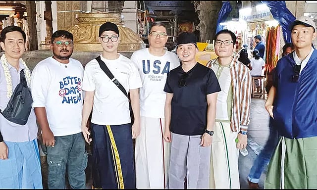 இந்த நிலையில் வியட்நாம் நாட்டைச் சேர்ந்தவர்கள் நேற்று நெல்லையப்பர் கோவிலுக்கு சாமி தரிசனம் செய்ய வந்தனர். அப்போது அவர்கள் தமிழர்களின் பாரம்பரிய உடைகளில் ஒன்றான வேட்டி அணிந்து வந்து சாமி தரிசனம் செய்தனர். பின்னர் கோவிலின் அனைத்து பகுதிகளையும் சுற்றிப்பார்த்தனர்.