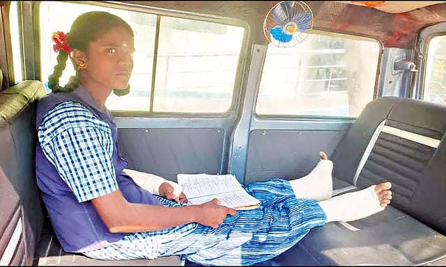 இந்தநிலையில் கடந்த ஜனவரி மாதம் மாடிப்படியில் இருந்து தவறி கீழே விழுந்தார். இதில் மாணவியின் 2 கால்கள், இடது கையில் எலும்பு முறிவு ஏற்பட்டது. இதையடுத்து அவர் ஆஸ்பத்திரியில் சிகிச்சைக்காக சேர்க்கப்பட்டார். தற்போது மாணவி வீட்டில் இருந்து வந்தார். எலும்பு முறிவு சரியாக கை, கால்களில் கட்டு போடப்பட்டு உள்ளது.