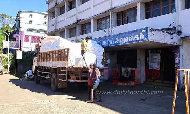 கோத்தகிரி தாலூகாவில் மொத்தம் 63 ரேஷன் கடைகள் செயல்பட்டு வருகின்றன. இந்த கடைகளில் அரிசி மட்டும் வாங்கும் ரேஷன் கார்டுதாரர்கள் 28 ஆயிரத்து 905 பேர் பயனாளிகளாக உள்ளனர். தமிழகத்தில் பொங்கல் பண்டிகையை சிறப்பாக கொண்டாடி மகிழும் வகையில், ரேஷன் கார்டுதாரர்களுக்கு இலவச வேட்டி, சேலைகள், ரொக்க பணம் மற்றும் தொகுப்பு வழங்கப்படும் என அறிவிக்கப்பட்டது. இலவச வேட்டி, சேலை வழங்குவதற்காக தமிழக அரசு ஜவுளி நிறுவனம் மூலம் அந்தந்த வட்ட வழங்கல் அலுவலகத்திற்கு வேட்டி, சேலைகள் அடங்கிய மூட்டைகள் பயனாளிகளின் எண்ணிக்கை அடிப்படையில் அனுப்பி வைக்கப்பட்டு வருகிறது. அதன் ஒரு பகுதியாக கோத்தகிரி தாசில்தார் அலுவலகத்தில் உள்ள வட்ட வழங்கல் அலுவலகத்துக்கு பொங்கல் பண்டிகைக்கு வினியோகம் செய்வதற்காக, 2 லாரிகளில் வேட்டி, சேலைகள் கொண்டு வரப்பட்டன. இவை மூட்டைகளில் தாசில்தார் அலுவலக மேல்தளத்தில் பாதுகாப்பாக அடுக்கி வைக்கப்பட்டு உள்ளது. இந்த இலவச வேட்டி, சேலைகள் அனைத்து ரேஷன் கடைகளுக்கும் பயனாளிகளின் எண்ணிக்கைக்கு ஏற்ப அனுப்பி வைக்கப்பட உள்ளதாக கோத்தகிரி வட்ட வழங்கல் அலுவலர் தெரிவித்தார்.
