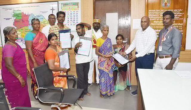 மாற்றுத்திறனாளிகள் சமூகத்தில் சுதந்திரமாகவும், ஏற்றத்தாழ்வு மனப்பான்மை இல்லாமல் வாழ்ந்திடும் வகையில் பல்வேறு திட்டங்களை தமிழ்நாடு முதல்-அமைச்சர் செயல்படுத்தி வருகிறார். குறிப்பாக நகர்ப்புற மற்றும் கிராமப்புறங்களில் வசிக்கும் வறுமைக்கோட்டிற்கு கீழ் உள்ள மாற்றுத்திறனாளிகளுக்கு முன்னுரிமை அடிப்படையில் இலவச வீட்டுமனைப்பட்டா வழங்கப்படும் என உத்தரவிட்டதுடன் சென்னை அண்ணா நினைவு நூற்றாண்டு அரங்கத்தில் 5 மாற்றுத்திறனாளிகளுக்கு இலவச வீட்டுமனைப்பட்டாவை வழங்கி இத்திட்டத்தை தொடங்கி வைத்தார். அதனடிப்படையில் விழுப்புரம் மாவட்டம் ரெட்டணையை சேர்ந்த அய்யனார், பொய்யப்பாக்கம் தீபா, வேலம்மாள், பாலமுருகன் ஆகிய மாற்றுத்திறனாளிகளுக்கு இலவச வீட்டுமனைப்பட்டாவை மாவட்ட கலெக்டர் சி.பழனி நேற்று வழங்கினார்.