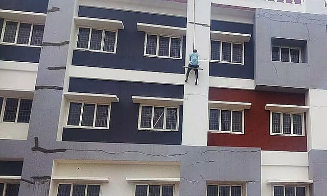 பிரமாண்டமான தோற்றத்தில் கட்டப்பட்டு இருந்தாலும் இந்த கட்டிடத்தின் சுவர்களில் அடிக்கடி விரிசல் ஏற்பட்டு வருகிறது. சமீபத்தில் கட்டிடத்தில் பல இடங்களில் விரிசல் ஏற்பட்டதை தொடர்ந்து கடந்த சில நாட்களாக சீரமைப்பு பணிகள் மேற்கொள்ளப்பட்டன. விரிசல் விழுந்த சுவர்களில் சிமெண்டு பூசும் பணியில் தொழிலாளர்கள் ஈடுபட்டனர். இதற்காக உயரமான கட்டிடத்தில் அந்தரத்தில் தொங்கியபடி ஆபத்தான நிலையில் தொழிலாளர்கள் பணியாற்றினர்.