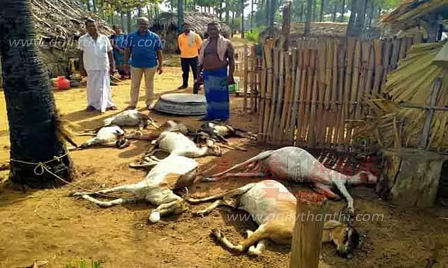 தூத்துக்குடி மாவட்டம் வேம்பார் கிராமத்தை சேர்ந்தவர் தேவசகாயம் (வயது 50). பனை தொழிலாளி. இவர், ராமநாதபுரம் மாவட்டம் சாயல்குடி அருகே கடுகு சந்தை சத்திரம் கிராமத்தில் பனை தொழில் செய்து வருகிறார். இவர் ஆடுகளும் வளர்த்து வருகிறார். நேற்று அதிகாலை சாயல்குடி மற்றும் அதன் சுற்று வட்டார பகுதிகளில் இடி, மின்னலுடன் பலத்த மழை பெய்தது. அப்போது மின்னல் தாக்கியதில் பனை மரத்தின் அடியில் கட்டி வைத்திருந்த 8 ஆடுகள் சம்பவ இடத்திலேயே இறந்தன. இதுகுறித்து வருவாய்த்துறை மற்றும் சாயல்குடி போலீசார் விசாரித்து வருகின்றனர்.