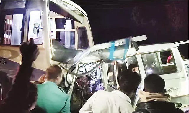 இந்த விபத்தில் காரின் முன்பகுதி முழுவதும் பஸ்சில் சிக்கி அப்பளம் போல் நொறுங்கியது. காருக்குள் இருந்தவர்கள் படுகாயம் அடைந்து உயிருக்கு போராடினர்.