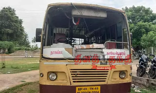 நாகையை சேர்ந்தவர் குமார் (வயது 57). இவர் தமிழ்நாடு அரசு போக்குவரத்து கழகத்தில் டிரைவராக வேலை பார்த்து வருகிறார். நேற்று முன்தினம் இரவு நாகையில் இருந்து காமேஸ்வரம் மீனவர் காலனி வரை செல்லக்கூடிய டவுன் பஸ்சை ஓட்டிச் சென்றார்.மீனவர் காலனிக்கு சென்று விட்டு அங்கிருந்து நாகை நோக்கி பஸ்சை ஓட்டியபடி வந்து கொண்டிருந்தார். காமேஸ்வரம் நால்ரோடு அருகே பஸ் வந்தபோது எதிரே மோட்டார் சைக்கிளில் வந்த மர்ம நபர்கள் தாங்கள் மறைத்து வைத்திருந்த கருங்கற்களால் பஸ்சின் முன்பக்க கண்ணாடியை உடைத்து விட்டு தப்பிச்சென்று விட்டனர்.