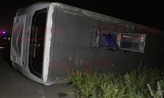 டிரைவரின் கட்டுப்பாட்டை இழந்த பஸ் சாலை நடுவில் இருந்த தடுப்புச் சுவரில் மோதி விபத்துக்கு உள்ளானது. இந்த விபத்தில் பஸ்சில் இருந்த 10 பயணிகள் காயம் அடைந்தனர்.