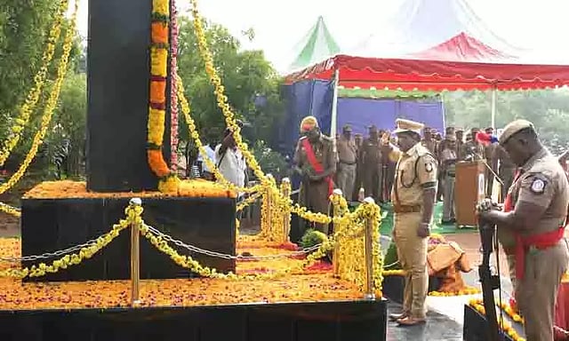 அப்போது இந்தாண்டு இந்தியாவின் பல்வேறு பகுதிகளில் நம்மை விட்டு பிரிந்த காவல் குடும்பத்தினரின் எண்ணிக்கை 188. மடிந்த இவர்கள் விட்டு சென்ற பணிகளை செய்து முடிப்போம் என உறுதிமொழி ஏற்கப்பட்டது. அதன்பின்னர் 60 குண்டுகள் முழங்க காவலர்களுக்கு வீரவணக்க அஞ்சலி செலுத்தப்பட்டது. இந்நிகழ்ச்சியில் கூடுதல் போலீஸ் சூப்பிரண்டுகள், துணை போலீஸ் சூப்பிரண்டு உள்ளிட்ட போலீஸ் அதிகாரிகள் நினைவு தூணில் மலர்வளையம் வைத்தும், மலர்தூவியும் மரியாதை செலுத்தினர். இதில் போலீஸ் அதிகாரிகள், போலீசார் உள்பட பலர் கலந்து கொண்டனர்.