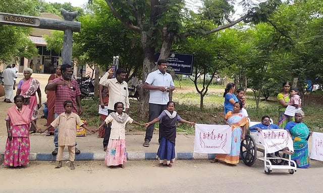 முன்னதாக மாவட்ட மாற்றுத்திறனாளிகள் அலுவலகம் முன்பு மனித சங்கிலி போல் நின்ற மாற்றுத்திறனாளிகள் கைகளில் ரோஜாப்பூவை ஏந்தி உயரம் தடைபட்டோருக்கான உலக மாற்றுத்திறனாளிகள் தினத்தை கொண்டாடினர்.