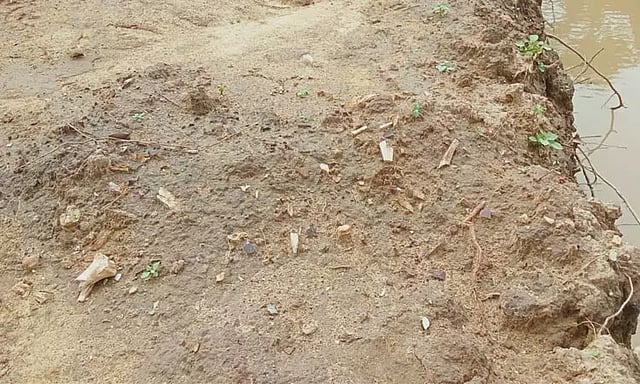 இந்த நிலையில் சாலை பணிக்காக அப்பகுதியில் உள்ள வாய்க்காலின் நீரோட்டத்தை திருப்பி விடுவதற்காக ஜே.சி.பி. எந்திரம் கொண்டு பள்ளம் தோண்டப்பட்டுள்ளது. இதனால் அப்பகுதியில் புதைந்திருந்த தொல்பொருட்கள் சிதைவடைந்த நிலையில் அந்த இடம் முழுக்க பரவி காணப்படுகிறது. மேலும், குவியல் குவியலாக எலும்புகளும் உள்ளது. இது மனிதனின் கால், முதுகு, முட்டெலும்பு போன்று உள்ளதால், சாலை அமைக்கும் முன்பு தொல்லியல் துறையினர் ஆய்வு செய்து இப்பகுதியை பாதுகாக்க வேண்டும் என்று வரலாற்று ஆர்வலர்கள் கோரிக்கை விடுத்துள்ளனர்.